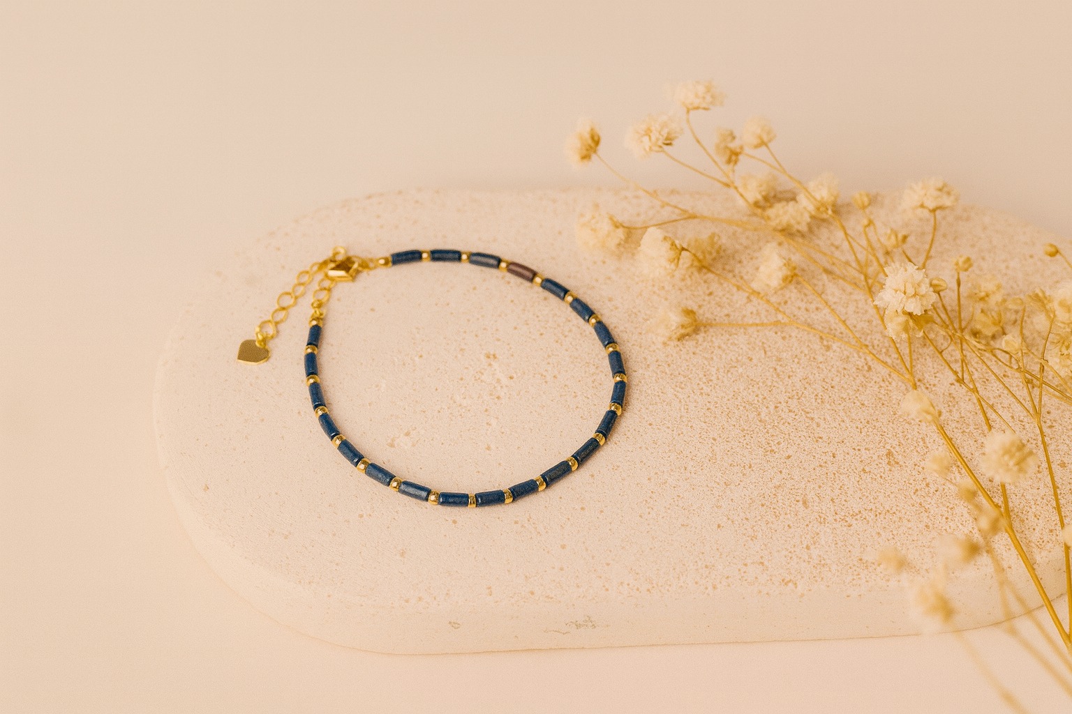 Élégant et raffiné, ce bracelet est composé de petites perles cylindriques bleues en pierre naturelle, séparées par des touches dorées délicates qui apportent luminosité et sophistication. Son fermoir ajustable, orné d’un petit pendentif en forme de cœur, permet un confort optimal et s’adapte à toutes les tailles de poignet.
