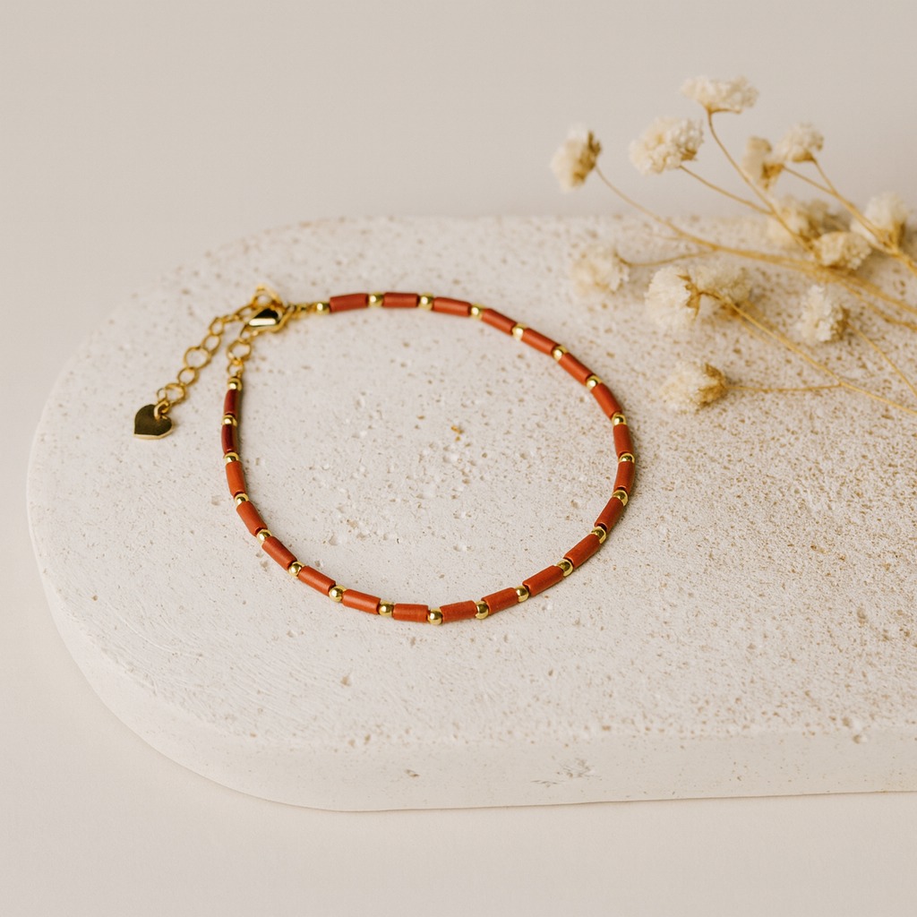 Élégant et raffiné, ce bracelet est composé de petites perles cylindriques rouge/ocre en pierre naturelle, séparées par des touches dorées délicates qui apportent luminosité et sophistication. Son fermoir ajustable, orné d’un petit pendentif en forme de cœur, permet un confort optimal et s’adapte à toutes les tailles de poignet.