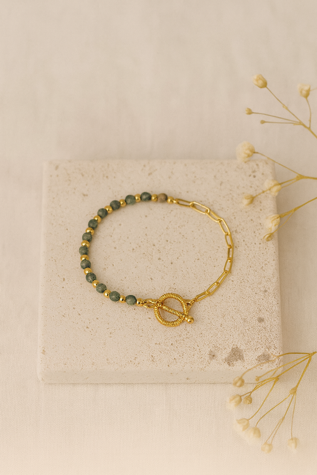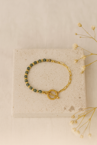 Inspiré de la ville de Jaipur, réputée pour ses pierres précieuses, ce bracelet incarne l’élégance et l’authenticité de l’artisanat indien. Ses perles vertes naturelles associées à des touches dorées rappellent la richesse des bijoux traditionnels et le charme des palais de Maharajas.