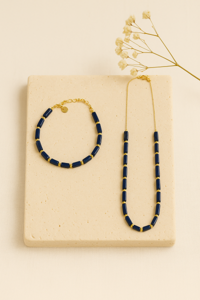 Évoquant les dômes bleus de l’île grecque qui se détachent sur la mer Égée, le collier Santorin incarne l’élégance méditerranéenne. Ses perles cylindriques bleu nuit, associées à de délicates touches dorées, apportent une allure raffinée et intemporelle.